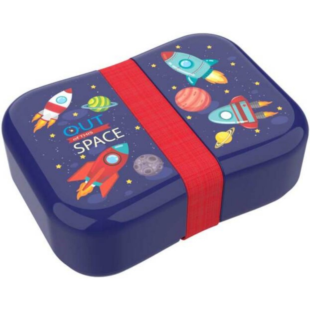 Broodtrommel Lunch Buddies Space heeft een handig elastiek dat alles op zijn plaats houdt.