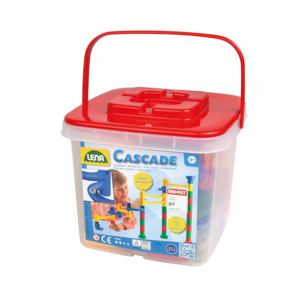 Cascade knikkerbaan bestaande uit 29 railelementen en 10 glazen knikkers. Uren lang vermaak gegarandeerd met deze mooie knikkerbaan. Maak verschillende variaties en zie hoe de knikkers naar beneden rollen. Als je klaar bent met spelen, kun je de onderdelen direct in de afsluitbare emmer opbergen. Superhandig!