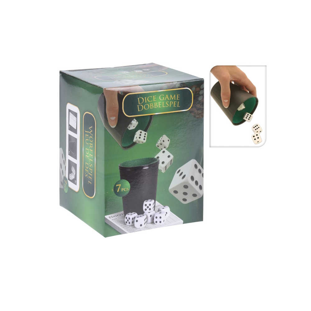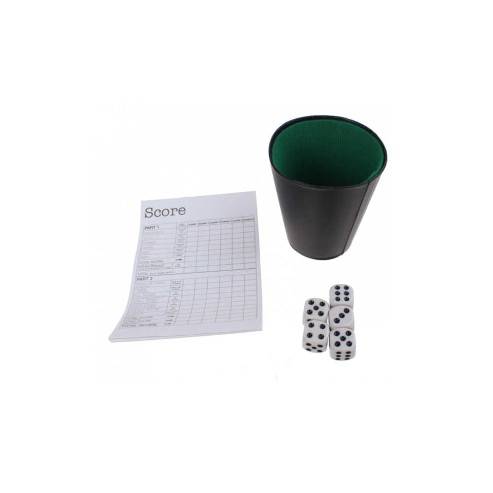 Dobbelstenen spel met beker. Gooi jij een grote straat? Inhoud: 5 dobbelstenen, 1 zwarte beker en een spelblok van 25 vellen