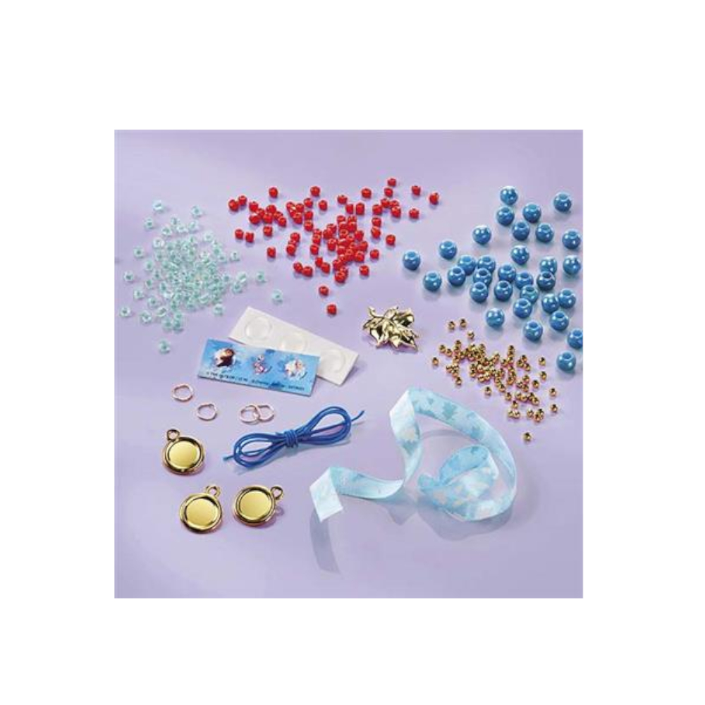 Met deze Frozen 2  Mythical Armband set kunnen kinderen zelf armbandjes maken. Door middel van een lint kunnen de armbandjes tot één armband worden gemaakt. Met de bedeltjes van Elsa, Anna en Olaf kunnen de armbandjes worden versierd. Het setje bestaat uit 3 goudkleurige bedels, goudkleurige bladbedel, meer dan 200 kralen, satijnlint, doorzichtige stickers, stickervel, elastisch draad, metalen ringetjes en een gebruiksaanwijzing. Geschikt voor kinderen vanaf 5 jaar.