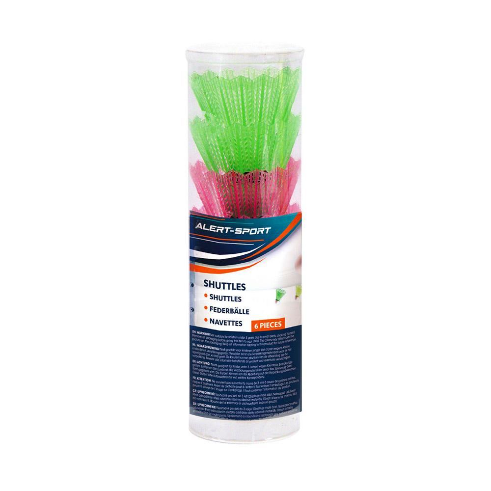 6 Opvallende badminton shuttles. De shuttles van alert-sport zijn in 6 verschillende kleuren. Rood, blauw, wit, groen, oranje en paars.