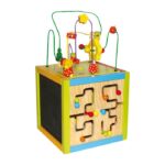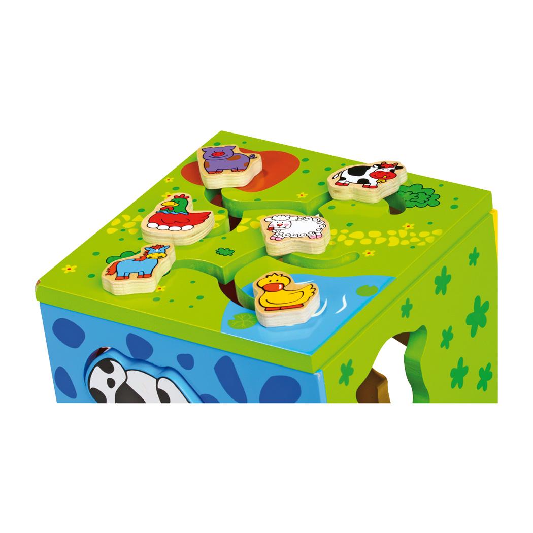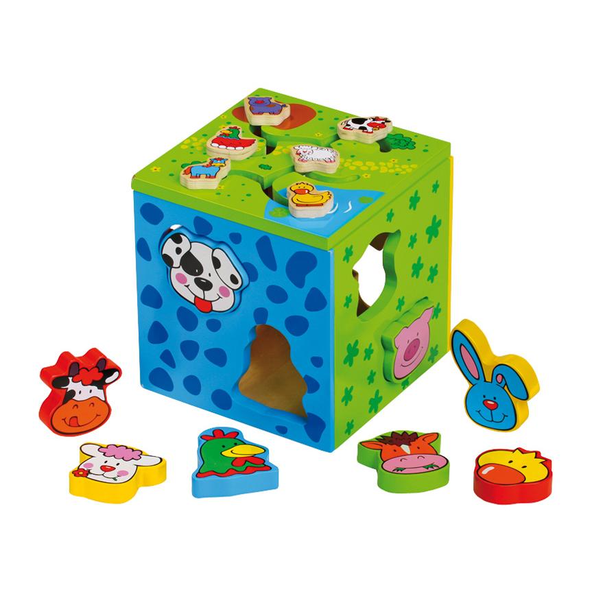 Kleurrijk beschilderd en bedrukt met kindvriendelijke motieven. Op de afneembare deksel staan 6 verschillende motieven afgebeeld. Er kunnen 8 leuke dierenkoppen worden geplaatst op basis van hun vorm in de openingen van de kubus. Een uitstekend hulpmiddel om de motorieke vaardigheden van een kind te verbeteren!