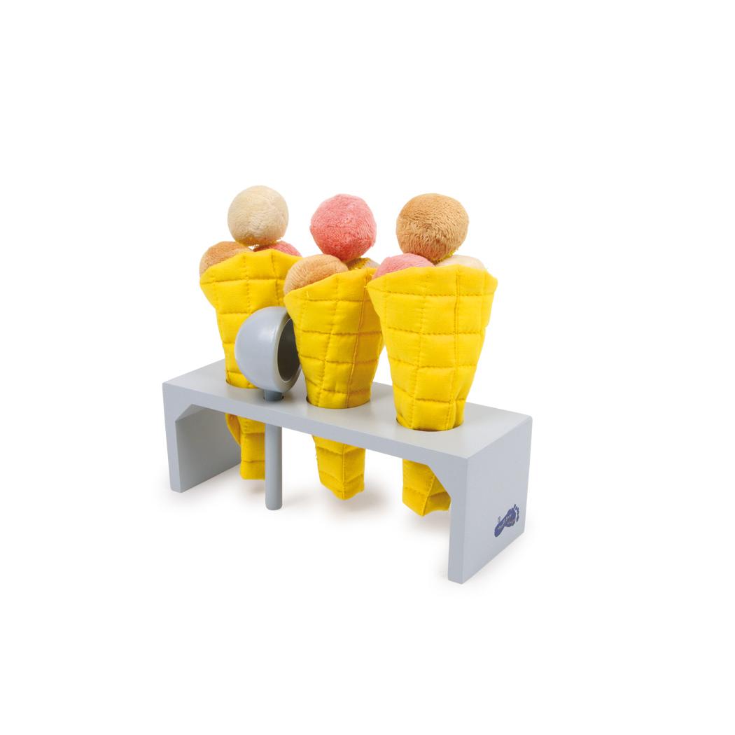 Yummy! Dit is een heerlijk toetje voor iedereen! De ijsbolletjes zijn gemaakt van stof en met elkaar verbonden door middel van klittenband. De wafels zijn gemaakt van gewalst zacht textiel. De ijshouder en de ijsschep zijn gemaakt van fraai gelakt hout en mag absoluut niet ontbreken in een kinderkeuken! Vormt een ideale aanvulling op onze overige keukenartikelen.