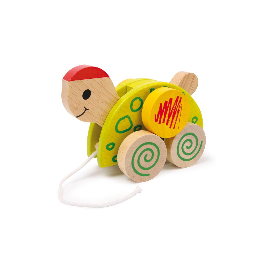 Deze fraai uitziende schildpad wiebelt met zijn kop en staart als hij wordt voortgetrokken door middel van het touw.