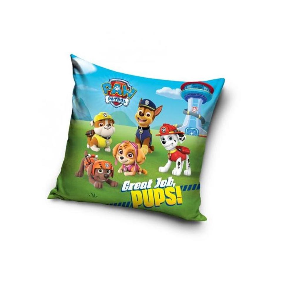 Vrolijk decoratief  kussensloop in het blauw met een afbeelding van Chase, Rubble, Skye, Zuma en Marshall op de voor- en achterzijde met de tekst Great Job Pups!