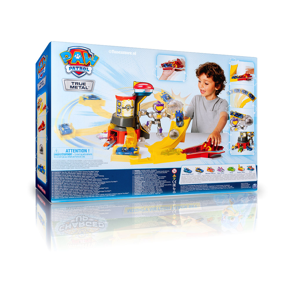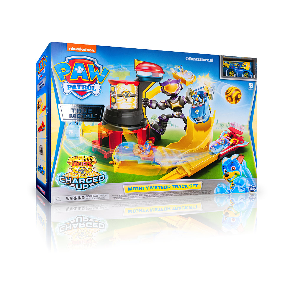 Deze geweldige Paw Patrol True Mighty Meteor track set is geschikt voor alle kleine Metal die cast autootjes van Paw Patrol. Met deze stoere actie baan schiet je de Paw Patrol autootjes in het rond. De baan is gemakkelijk in elkaar te zetten en is geschikt voor kinderen vanaf 4 jaar. Bij deze set wordt het autootjes Mighty metal Chase meegeleverd.