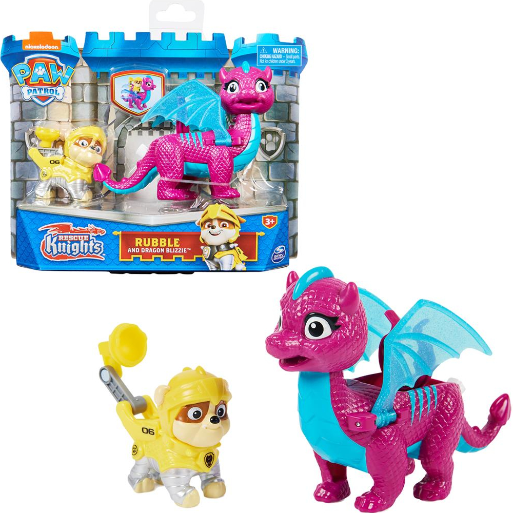 Paw Patrol reist naar de middeleeuwen. Ga mee met je favoriete pups en hun nieuwe drakenvriendjes, en beleef spannende reddingsmissies met de Rescue Knights Pup en Draak-sets. Deze set actiefiguren bevat Rubble en zijn trouwe drakenvriendje Blizzie. De geliefde pup van Paw Patrol draagt zijn Rescue Knights-harnas en is klaar om in actie te komen. Druk op de badgeknop van Rubble om het gereedschap in zijn rugzak te transformeren en open te klappen. Klem Rubble vervolgens op de rug van Blizzie en druk op de knop op de staart om de glinsterende, doorzichtige vleugels te laten bewegen. Deze geweldige set brengt al het middeleeuwse plezier van de populaire tv-serie tot leven. Verzamel alle Rescue Knights Pup en Draak-sets en gebruik je fantasie om keer op keer je eigen reddingsmissies te verzinnen. Inhoud: 1 Paw Patrol-figuur, 1 draakfiguur. Wordt geleverd in touchbox. Geschikt voor kinderen vanaf 3 jaar.