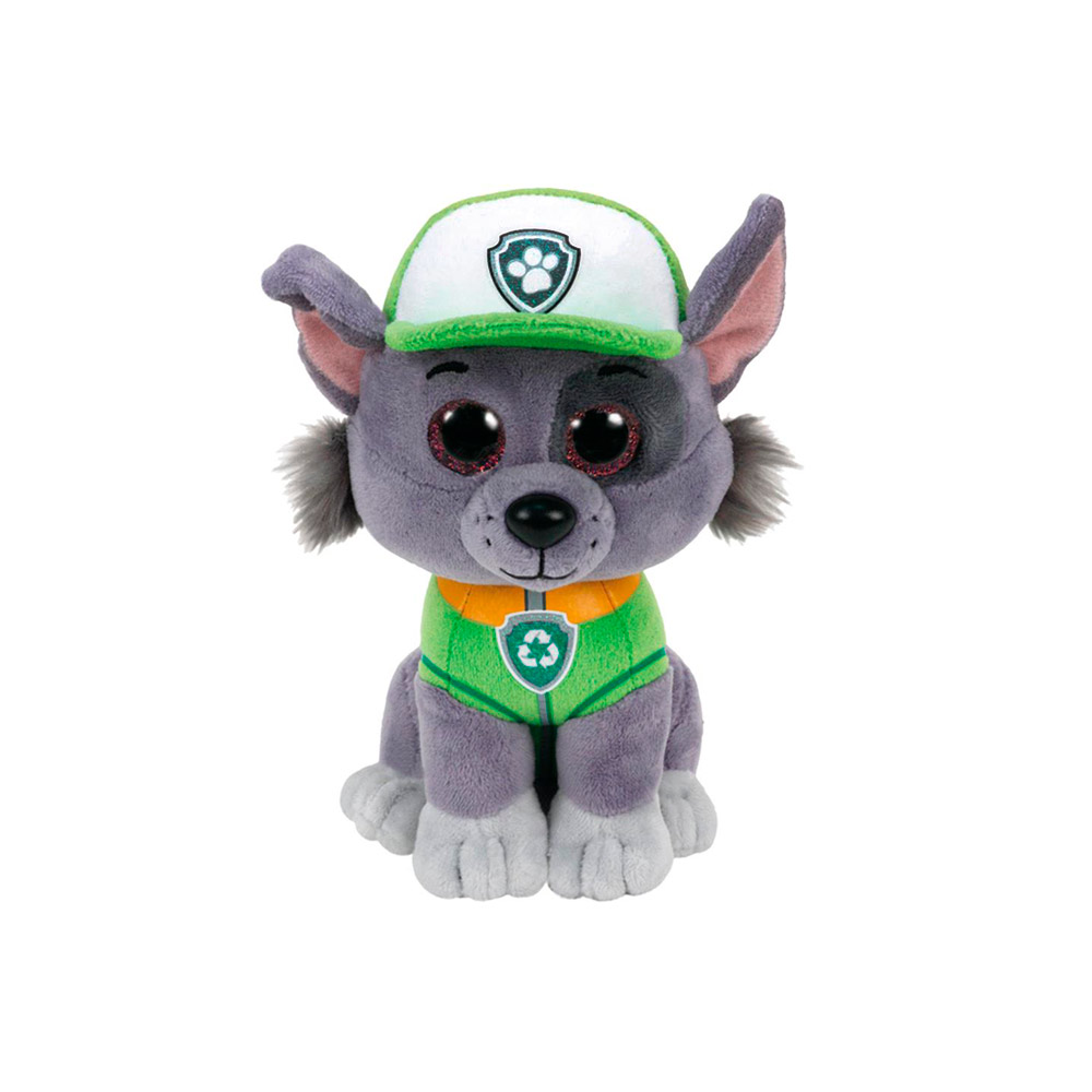 Pluche Paw Patrol Rocky knuffel in een groene outfit. De knuffel heeft de bekende TY ogen en is 24 cm groot.