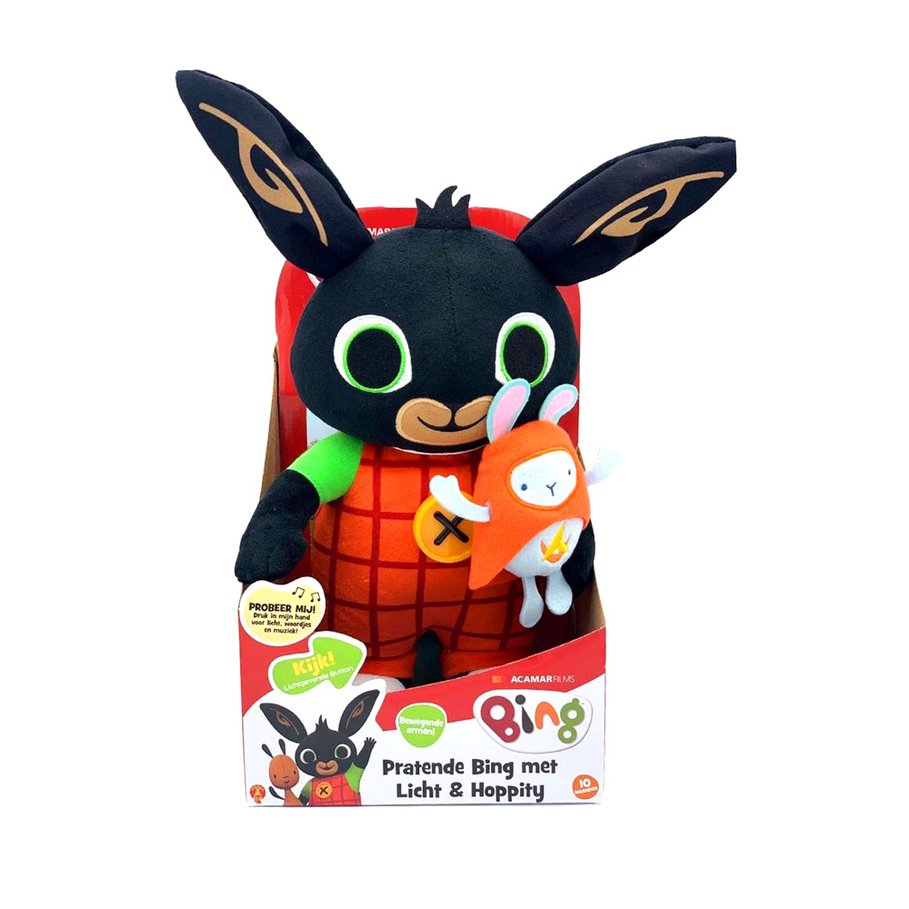Kijk jij ook altijd naar de avonturen van Bing en zijn vriendjes? Dan ben je vast ook dol op deze Pratende Bing knuffel! Natuurlijk draagt hij zijn stoere rode, geruite tuinbroek met button, net zoals in de animatieserie. En kijk eens wie hij bij zich heeft? Het is zijn grote vriend Hoppity Voosh! Hoppity draagt zijn zachte rode cape en je kunt ook los met hem spelen! Druk in Bing’s hand en zijn button zal oplichten, terwijl hij zal lachen en praten. Hij zegt wel 15 leuke woorden en zinnen. Bing heeft ook verstelbare armen. Bing en Hoppity zijn zeer gedetailleerd gemaakt van zachte stof, dus je kunt heerlijk met hen knuffelen! Bing is ca. 37 cm groot.