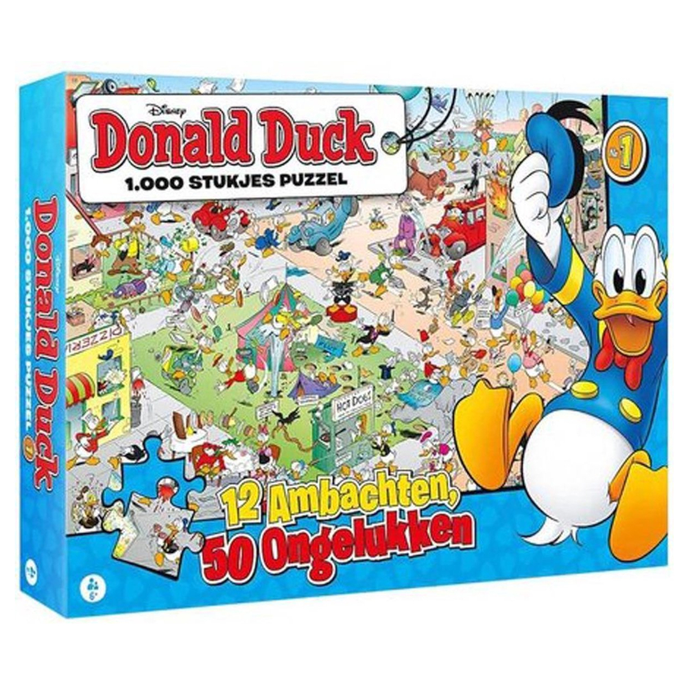 Donald Duck is het vrolijkste weekblad van Nederland! Beleef de spannende en grappige avonturen van Donald en zijn neefjes, Katrien, oom Dagobert, de Zware Jongens en andere inwoners uit Duckstad. De puzzel is opgebouwd uit 1000 stukjes en is geschikt voor puzzelaars van 6 tot 106! Dat een ongeluk in een klein hoekje zit wist je vast al, maar dat er zóveel fout kan gaan, bewijst Donald Duck. Overal gaat het mis bij de woerd van 12 ambachten, 50 ongelukken…