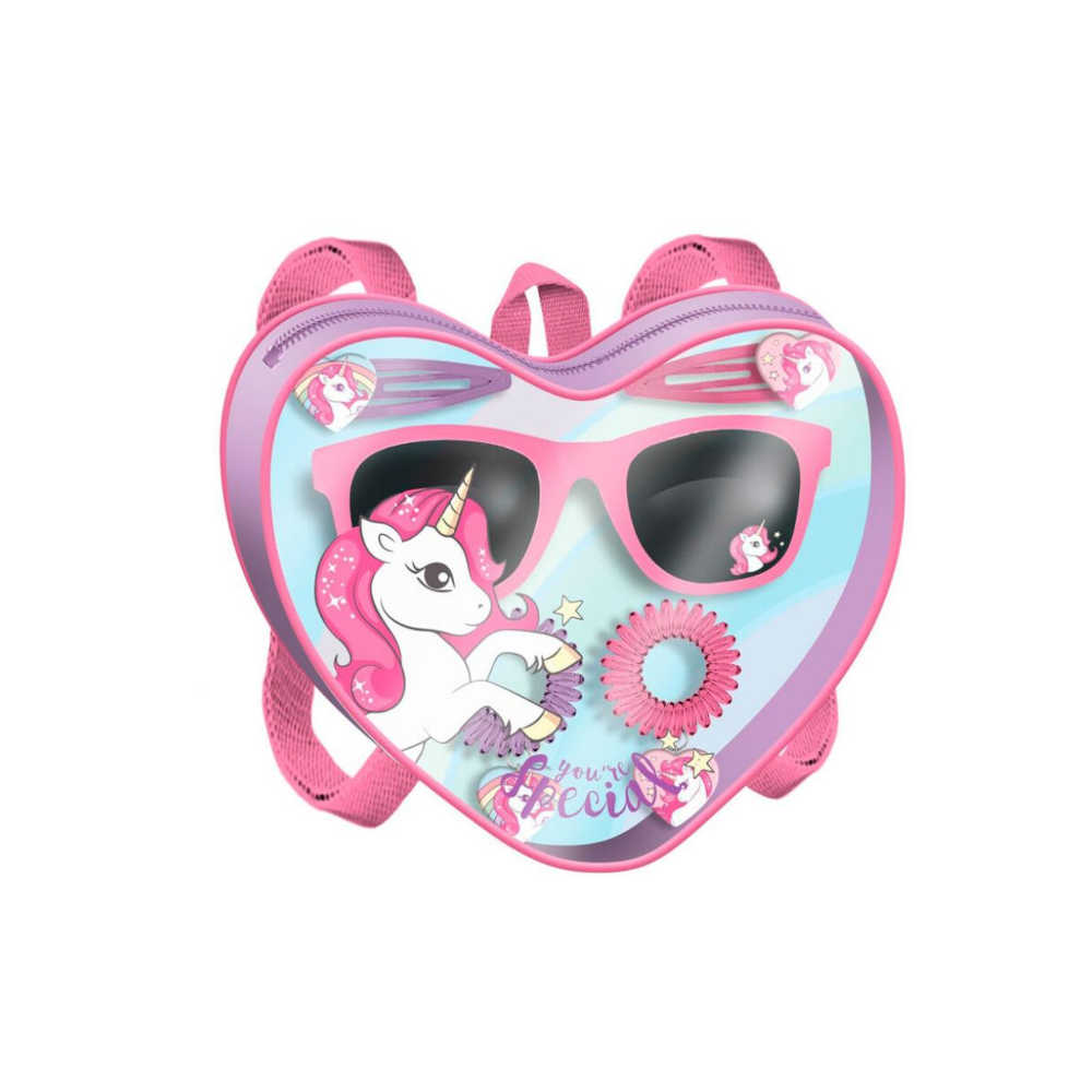 Deze set bestaat uit een leuk hartvormig tasje met daarin een Unicorn zonnebril en verschillende haaraccessoires zoals elastiekjes en knipjes.