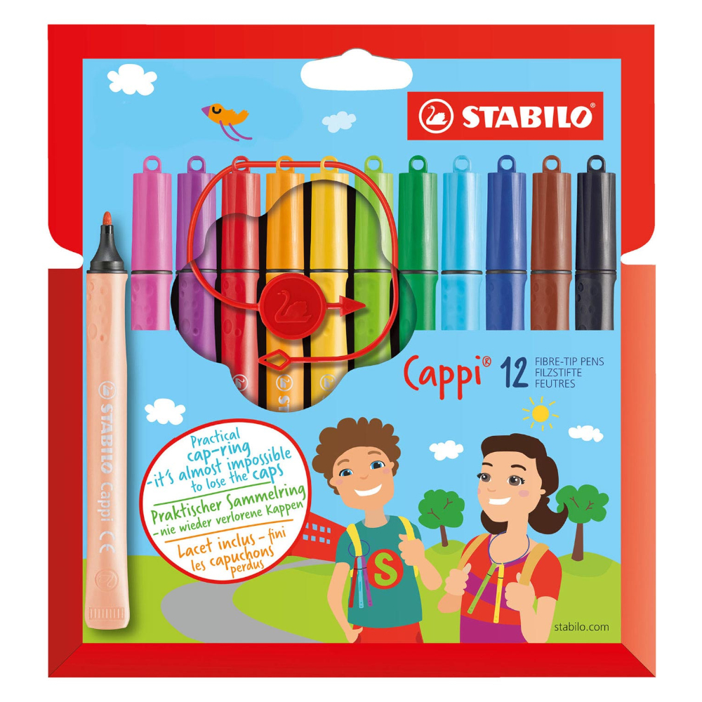 Raak de doppen van je stiften nooit meer kwijt met de Viltstiften Stabilo Cappi Etui 12 Stuks. De Stabilo Cappi rekent voorgoed af met zoekgeraakte doppen. De doppen van de stiften kunnen aan een flexibele ring worden bevestigd zodat ze netjes bij elkaar worden gehouden. De Cappi is ergonomisch vormgegeven, zodat de kinderhand optimaal wordt ondersteund tijdens het kleuren. Ideaal voor onderweg, bijvoorbeeld in de trein, auto of het vliegtuig. De etui bevat twaalf stiften in verschillende kleuren. Dit product is geschikt voor kinderen vanaf vier jaar.